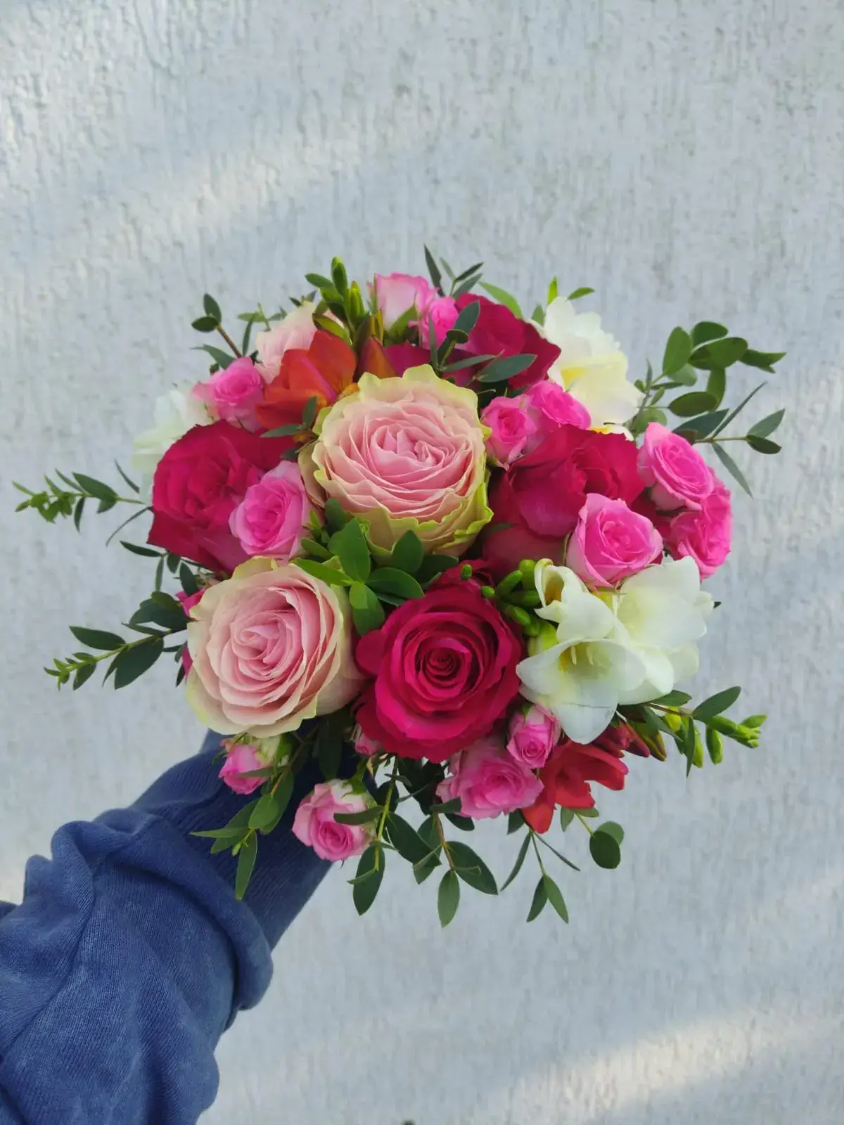 Buchet mireasă/ nașă format din 25 fire, cu trandafiri, mini rose, frezii și verdeață.