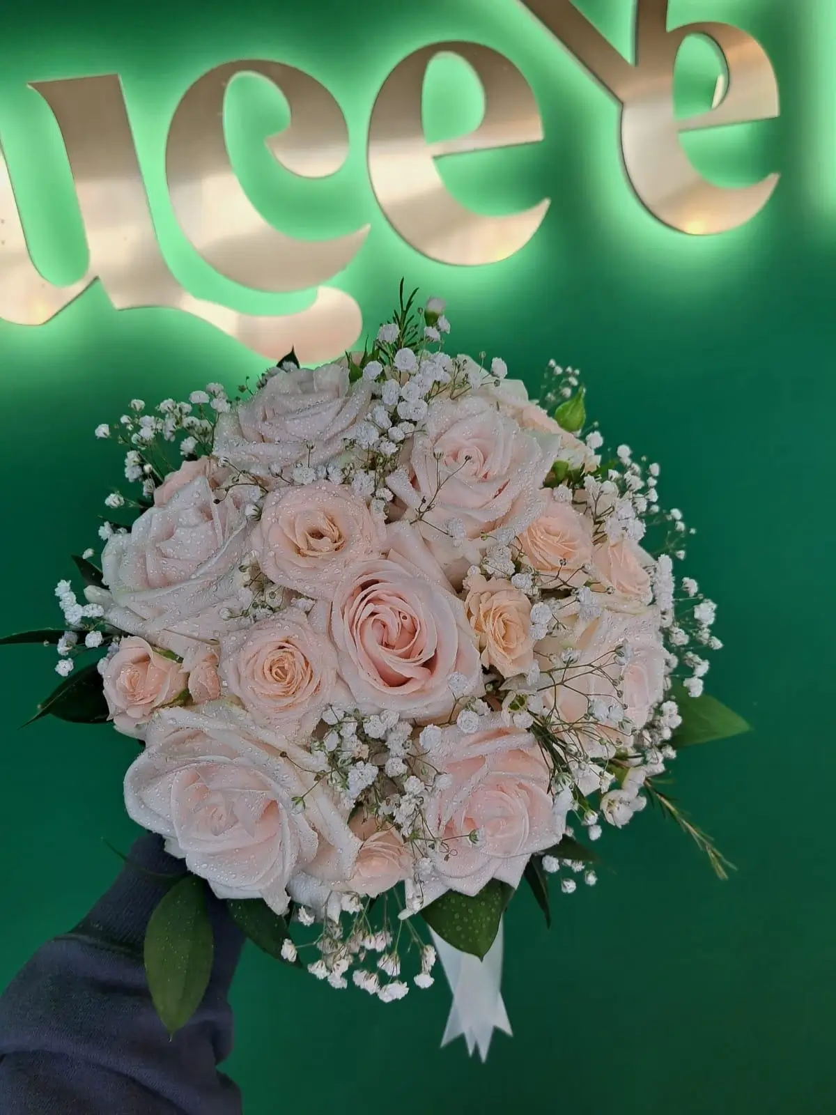 Buchet mireasă/ nașă format din 17 fire, cu trandafiri, gypsophila și verdeață.