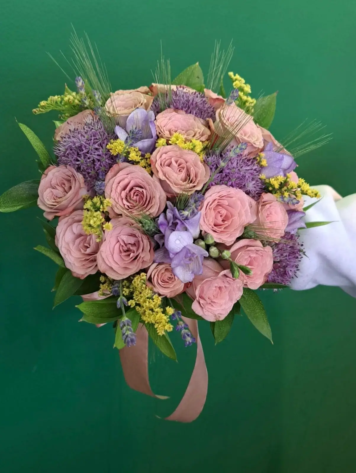 Buchet mireasă/ nașă format din 35 fire, cu trandaifiri roz, frezii, lavanda, allium, limonium și verdeață.