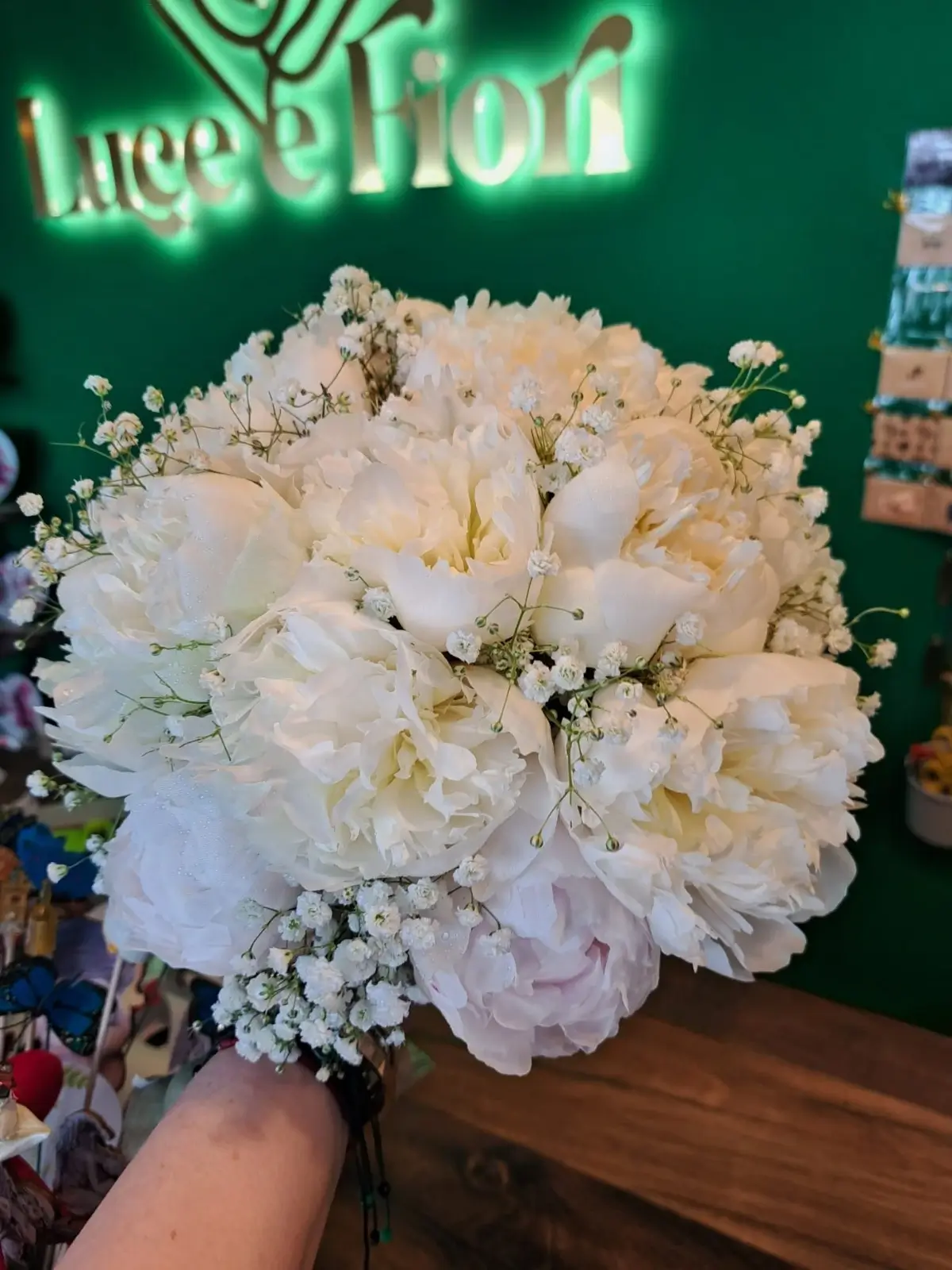Buchet mireasă/ nașă format din 15 fire, cu bujori albi, gypsophila și verdeață.