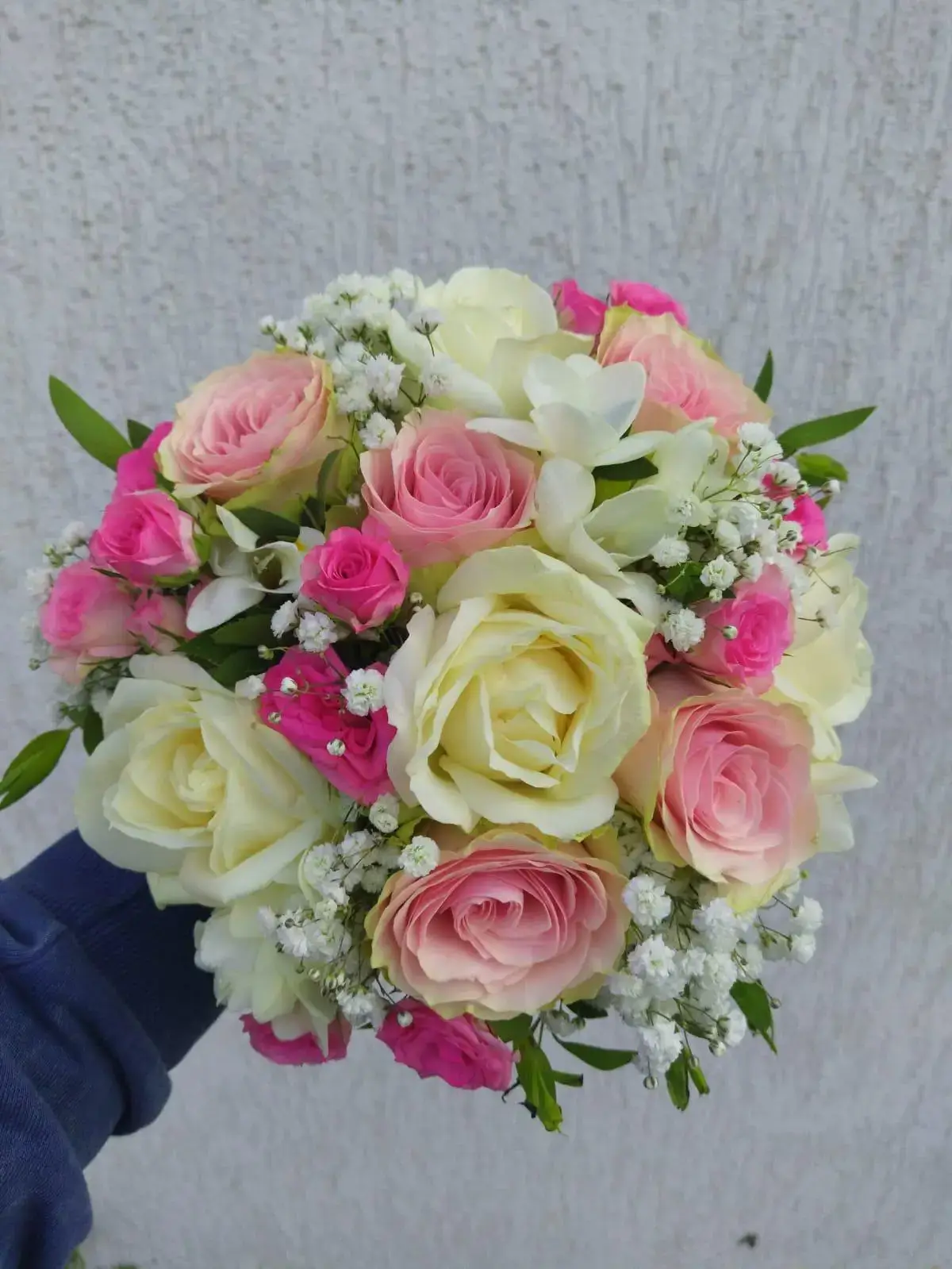 Buchet mireasă/ nașă format din 23 fire, cu trandafiri, mini rose, frezii, gypsophila și verdeață.