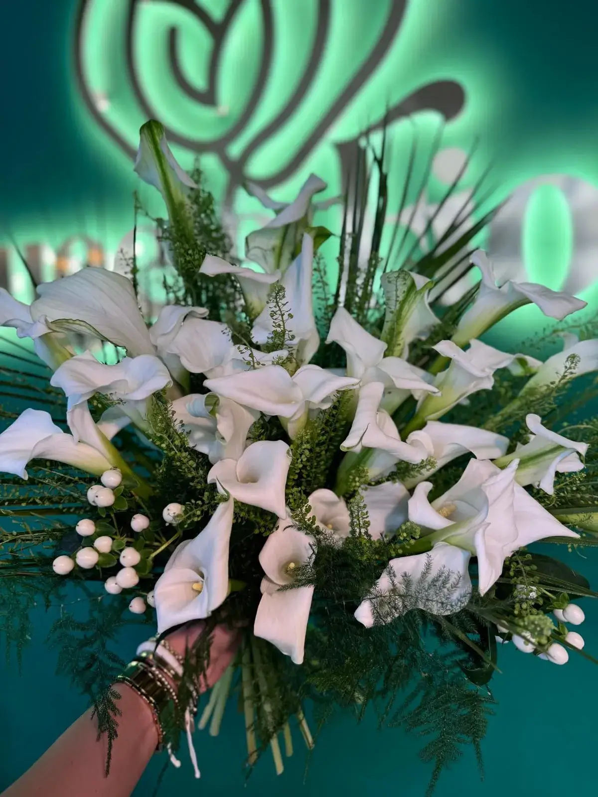 Buchet mireasă/ nașă format din 33 fire, cu cale albe, hypericum și verdeață.