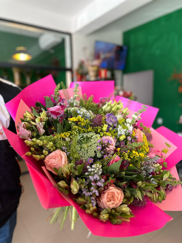 Buchet cu 41 flori de sezon și verdeață cu ambalaj. Florile și culorile pot varia în funcție de stoc.
