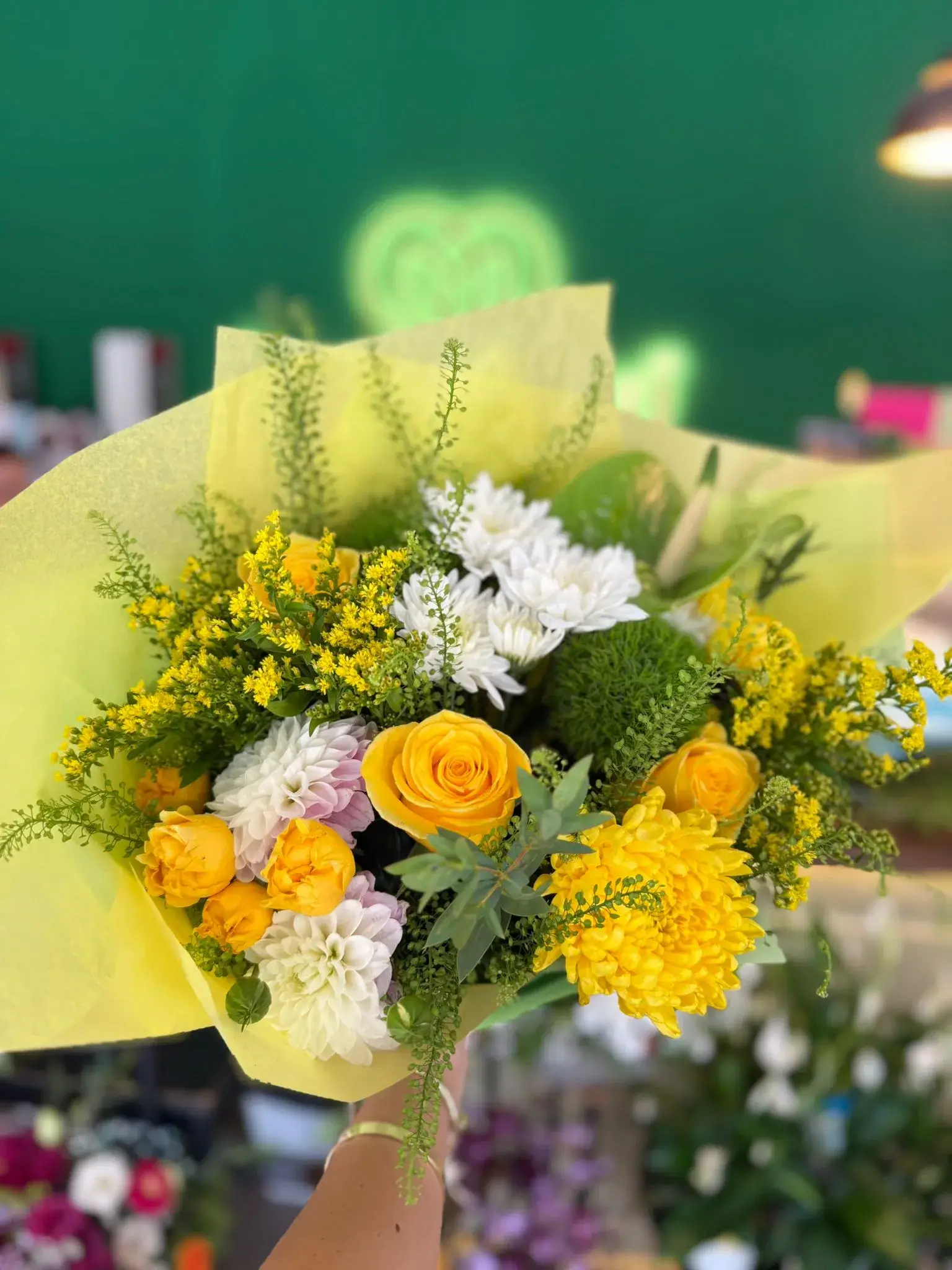 Buchet format din 15 de fire, cu trandafiri, crizanteme, solidago, dalii, green trick, anthurium, și verdeață, cu ambalaj.