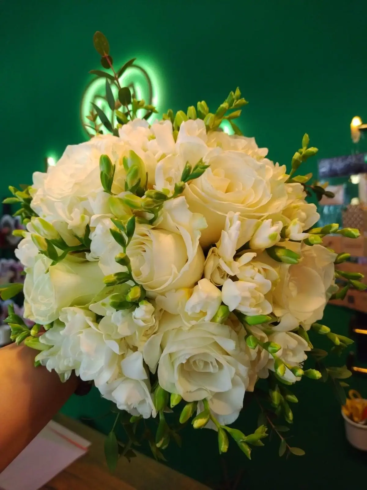 Buchet mireasă/ nașă format din 23 fire, cu trandafiri albi, frezii și verdeață.