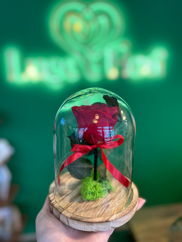 Trandafir criogenat în cupolă de sticlă (18 cm). Culoarea poate varia în funcție de stoc.